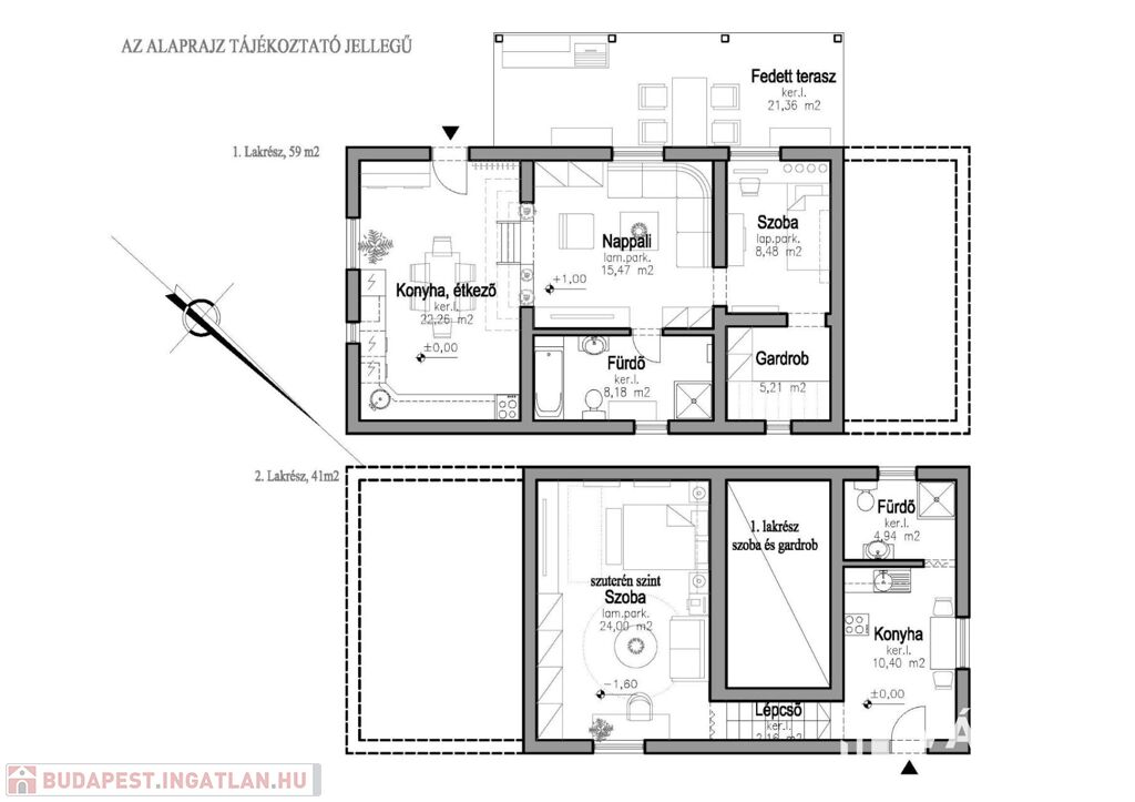 A két lakrész összenyitható, a gardrób helyiség átalakításával, lépcső beépítésével.