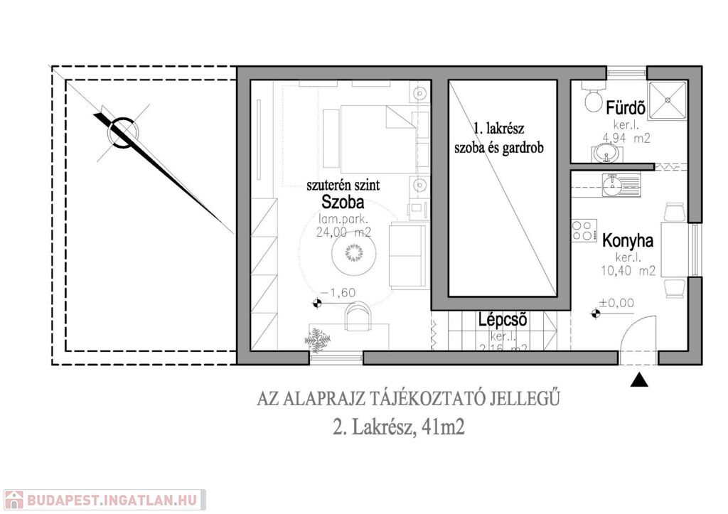 A ~41,00 m2 alapterületű lakóegység 2021.-ben kapta meg a mai arculatát. Itt is új külső nyílászárók kerültek beépítésre. Új a fürdőszoba és a konyha helyiség. Az itt található 24 m2 területű szoba szuterén szinten helyezkedik el. (lásd : alaprajzok)