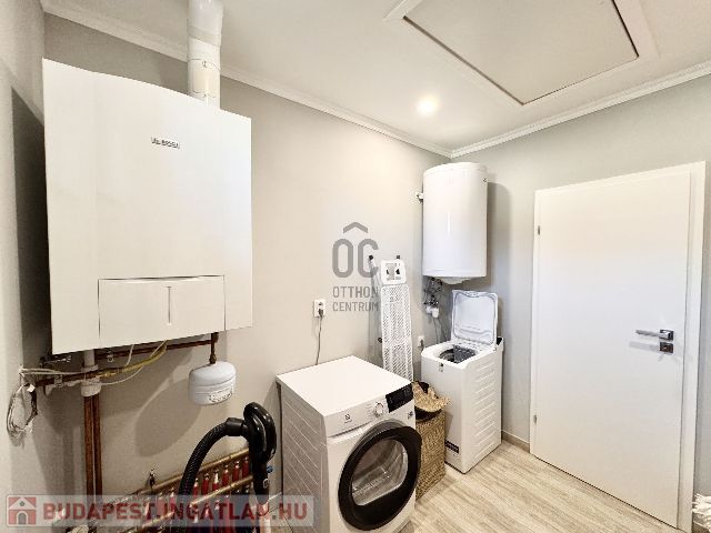 A ház fűtése gáz cirkóval, míg a hűtése 3 db inverteres klímával megoldott, így az év bármely szakaszában kellemes hőmérsékletet élvezhetünk az ingatlanban. A háztartási helyiségben villanybojler is rendelkezésre áll, ami most jelenleg tartalék.