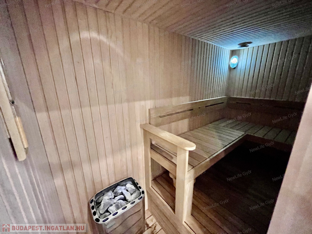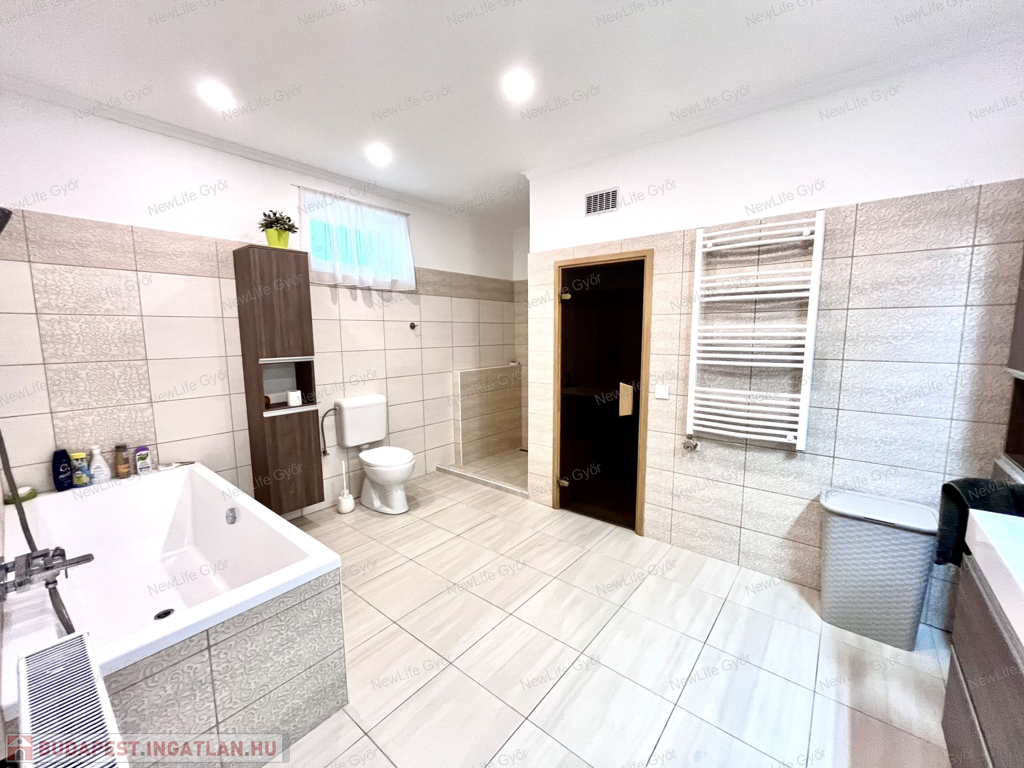 A fürdőszoba hatalmas, mosdókagyló szekrénnyel kád, zuhany, mosdó is található benne,valamint egy többszemélyes szauna.
