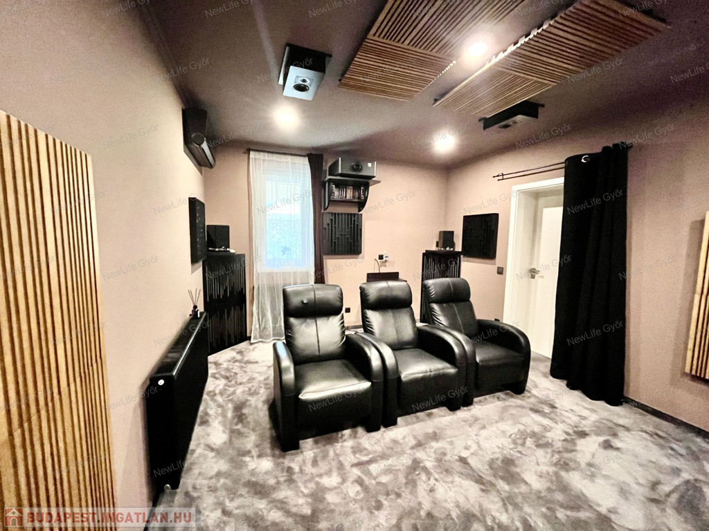 A házban nappali+ 4 szoba található. Jelenleg 3 hálószoba van,mindegyik szép, világos, kényelmes méretű. A negyedik szoba jelenleg moziszoba egy egyedileg kialakított, minőségi anyagokkal kivitelezett. A vastag szőnyeg, hangszigetelt falak, beépített hangfalak, kényelmes fotelek, vetítőgép. A szobát egyébként könnyedén át lehet alakítani rendes hálószobává.