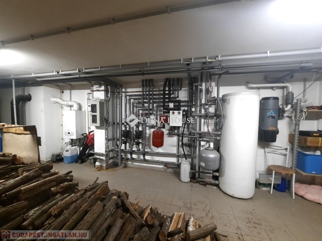 A ház alatt kialakított pincében található a kazánház. A fűtést kondenzációs gázkazán és faelgázosító kazán működteti padlófűtéssel és radiátorokon keresztül. A megújuló energiát hasznosító rendszerek (napelem és napkollektor) és a többlépcsős fűtési megoldások hosszú távon is biztonságos és költséghatékony működést garantálnak.