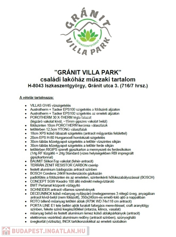 A Iszkaszentgyörgy-GRÁNIT Villapark, Székesfehérvártól csupán 5km-re, a Márványkert közelében található, 12 db önálló telken lévő 12 db önálló házzal rendelkezik, Házanként 152m2, 2 szint, saját telek (800m2- 925m2-ig), 20,5m2 terasz, minden ház 2 irányban tájolt, benapozott és átszellőztethető.