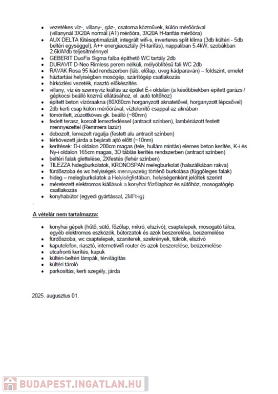 Az ingatlan összközműves, önálló helyrajzi számon lévő telekterületen az épület Porotherm 30 X-Therm téglából épült + 20cm szigeteléssel. A tető héjalása Terrán tetőcseréppel készült,. A fűtést szintenként szabályozható padlófűtés biztosítja. A melegvíz ellátás Heizer forróvíztároló biztosítja. A ház klimatizált , 5db beltéri egység található. A nyílászárók műanyag korszerű üvegezéssel, alumínium motoros redőnnyel ellátottak. A helyiségek burkolata, a beltéri ajtók, kapcsolók konnektorok… választhatók.