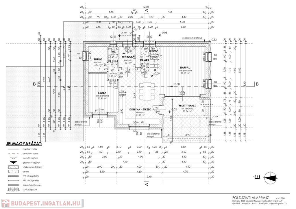 - Földszint: előtér, wc-kézmosó, tágas nappali- konyha-étkező,+ kamra, fürdő, fedett terasz (20m2)