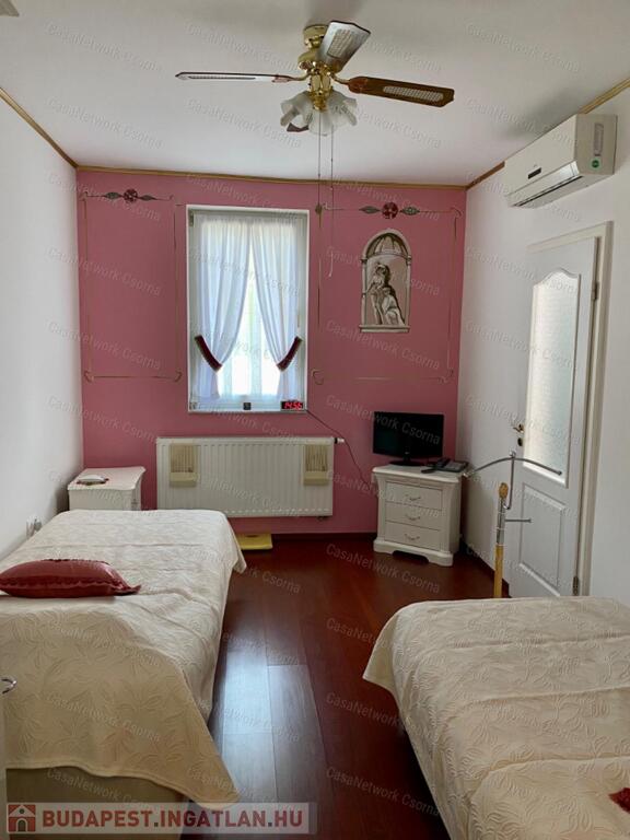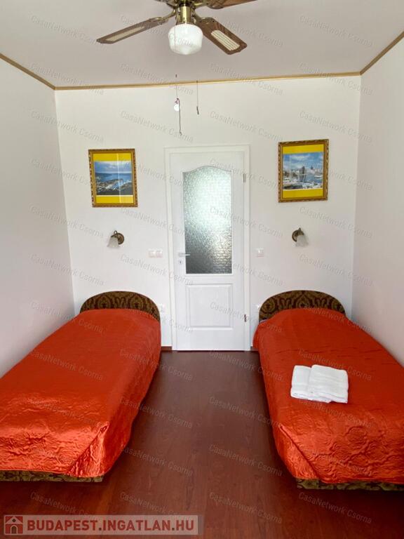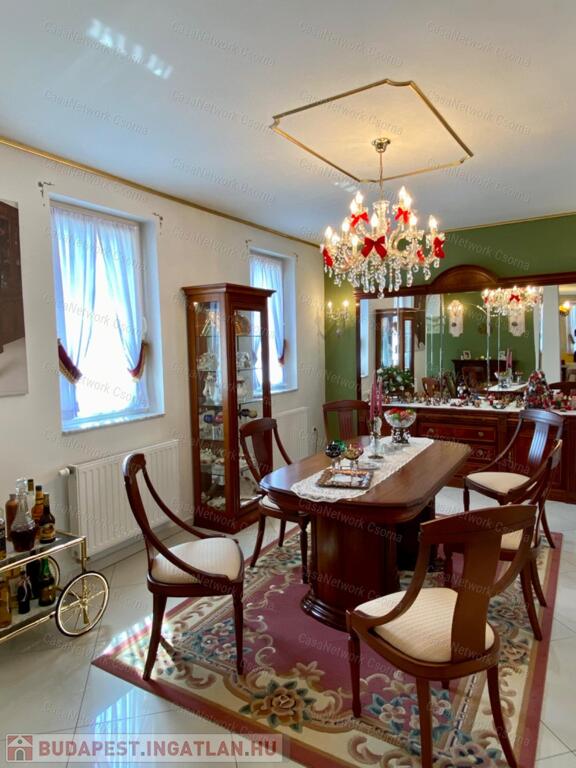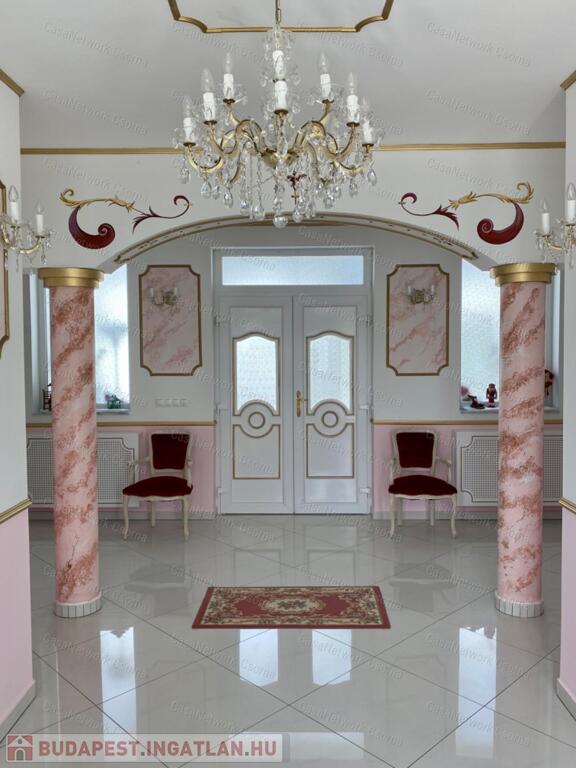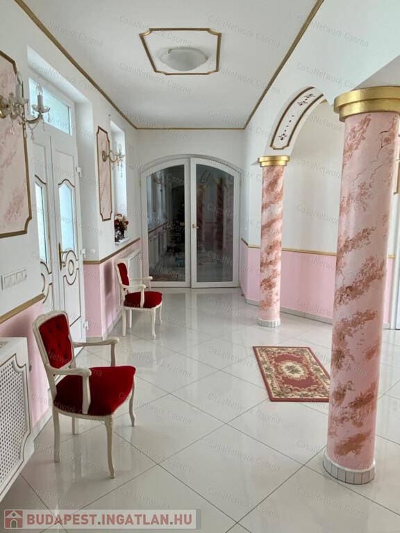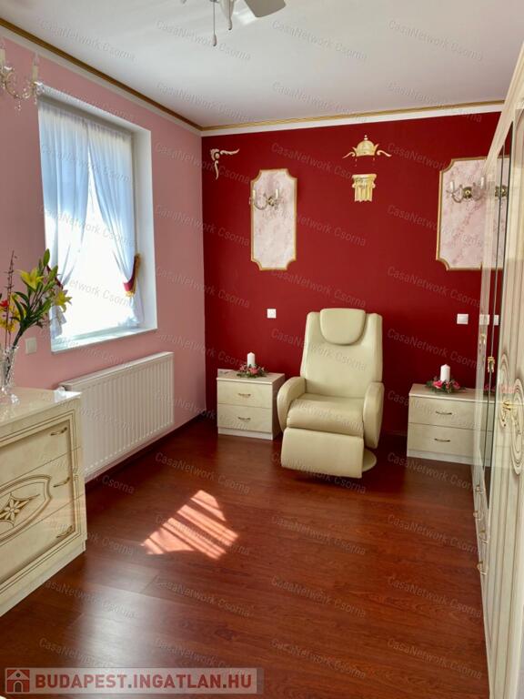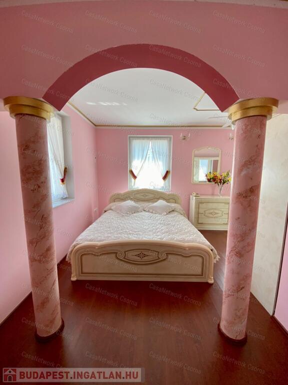 A kastély 3 csillagos amerikai stílusú kastélyszállóként üzemelt, melyhez 5 szoba tartozik, 20 fő elszállásolására van lehetőség. A szobák az udvarból nyílnak, így a saját lakóterülettől függetlenek. Ezek a szobák üzemelhetnek újra szállóként, vagy: tárolóként, hobbiszobaként, vendégszobaként. Mindegyik saját fürdővel rendelkezik. Felszereltsége: tv, hűtő, ventilátor, asztal, főzőlap.A lakótér szintén amerikai stílusban készült el, 3 hálószoba fő hálóval mindegyikéhez tartozik fürdőszoba,plafon ventilátor, többségében klíma. Továbbá amerikai stílusjegyek szintén felfedezhetőek az amerikai dupla konyhában, mind a bútorzat, mind a gépesítés duplán lett beszerelve. A kastélyban tovább sétálva találhatunk olvasó szobát, zene szobát ahol zongora található meg (1870-es évekből származó 100%fa zongora), gardróbot, nem maradhat el a társalgó, szalon sem. Továbbá felhívnám figyelmét az igényes, minőségi anyaghasználatra, amitől ez az ingatlan igazán értékes lesz: -réz kilincsek, márvány párkányok belül, réz kívül, kristály üveg ajtók, selyem függönyök, 24k aranyozott festések, oszlopok (14db) festése (művészek által festett, motívumok szintén), festmények, motívumok, alumínium ereszek, kettős hódfarkú kastélycserép, réz féltorony, alumínium zsalugáterek, mahagóni laminált padló, a korhű bútorok és csillárok Spanyolországból származnak, mindenből a legmodernebb a gépesítést figyelembe véve.Fűtésrendszere gázkazánnal és elektromos fűtéssel megoldott, két szárnyban külön-külön megtalálható a kazánház. A kastély erős alapokra épült, pénzt nem spórolva szakszerűen emelték meg a telek magasságát 1,8m-el. Az ingatlan tovább bővíthető,, megemelhető egy szinttel. Így az alapterület megduplázható, jelentősen pénztárca kímélőbben. Ipari áram a garázsba bevezetésre került. 2 fúrt kút ad vízellátást az antikolt szökőkutaknak, amelyek idényszerűen biztosítják a kellemes hangulatot az udvarban. A monolit vasbetonból födém minden statikai követelményt kielégít. A 2 külön szárny tűzzáró ajtókkal lett elválasztva egymástól a nagyobb biztonság érdekében. 8cm szigetelést és nemesvakolatot kapott a ház kívülről. 3,5 férőhelyes garázsban több autó is kényelmesen elfér. A kastély mellet található közművesített 720m2-es építési telek szintén eladó a kastéllyal együtt +30 millió ft-ért. Amennyiben felkeltette figyelmét az ingatlan, vagy kérdése