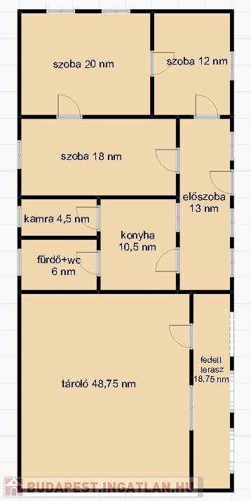 - Az ingatlanban található helyiségek: szobák (20 m2, 12 m2 és18 m2), konyha 10,5 m2, előszoba 13 m2, fürdő+wc 6 m2, kamra 4,5 m2, tároló 48,75 m2, fedett terasz 18,75 m2,
