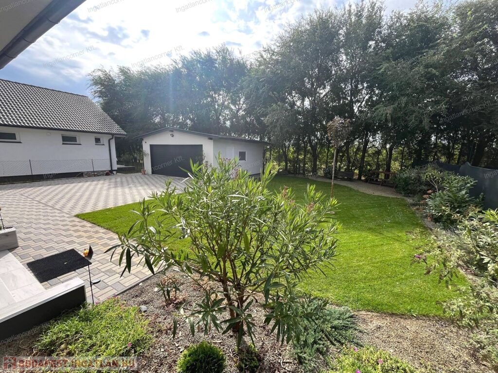 - KERT: A szépen parkosított kert locsolása fúrt kútról működő 5 körös automata öntözőrendszerrel történik, így a telek előtt, az utcai részen ültetett fák alatt is van öntözőrendszer. A kert végében csodás látványt nyújt a szomszéd telek 10 hektáros gyümölcsöse.