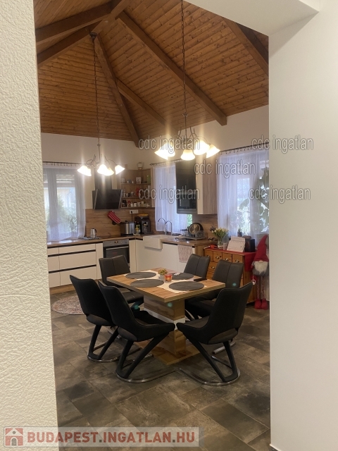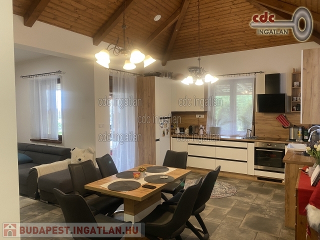 Kizárólag a CDC Ingatlaniroda kínálatában! Kakucs új parcellázású, csendes utcájában, új építésű házak szomszédságában, gyönyörű, nívós családi ház eladó! Az ingatlan 2019-ben épült porotherm téglából, 10 cm-es szigeteléssel. Az exkluzív ház 119m2-es, ebbe az alapterületbe a 24 m2-es garázs is beletartozik, mely közvetlen kapcsolatban van a házzal, átjárható és ugyanolyan értéket képvisel, mint a ház, burkolattal, fűtéssel, ablakokkal ellátott, így akár 1-2 szoba is kialakítható belőle, csak az elektromos garázsajtót kell lecserélnie normál ajtóra és már kész is az új szoba. A ház 2 szobával rendelkezik, amerikai konyhás nappali-étkezővel, (itt a különlegesség a fával kirakott nagy belmagasság), tágas fürdőszoba, háztartási helyiség, kazánház, külön wc és szép tágas előszoba helyiségekből áll. Fűtése gázcirkóval megoldott padlófűtésen és radiátorokon keresztül, valamint légtechnikával szerelt, mely hűtő-fűtő funkciót tölt be. Gyönyörű burkolatok, beltéri ajtók díszítik a házat, a nyílászárói elektromos alumínium redőnnyel szereltek. 2 fedett terasz öleli körbe a házat. A biztonságról 6 kamerás rendszer gondoskodik. Udvara 957 m2-es, szépen parkosított, részben viacolorral burkolt, elektromos kapuval szerelt. A locsolás fúrt kútról megoldott öntözőrendszeren keresztül. A kertben helyet kapott egy igényes, 18 m2-es faház, mely jelenleg tároló funkciót tölt be. A beépített konyhabútor gépekkel és a beépített gardróbszekrény a vételár részét képezi. Egy tökéletes, impozáns otthont ajánlok figyelmébe, ha szeretné megtekinteni, kérem hívjon bizalommal!