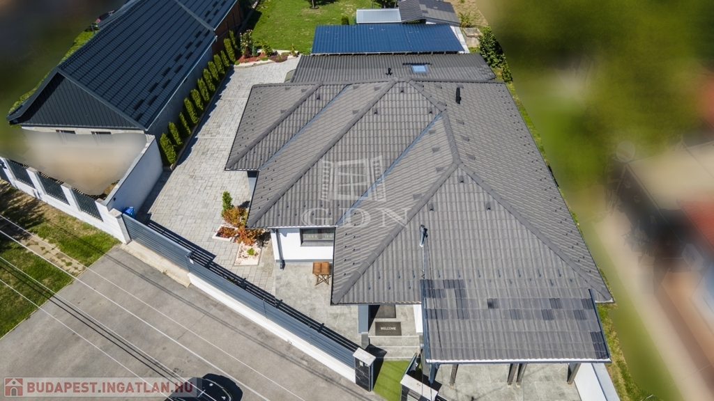 Az udvar részét képezi a 60 nm-es fedett terasz, mely egyben kocsibeálló is, valamint egy kinti zárt grillező és 3 tároló helyiség.