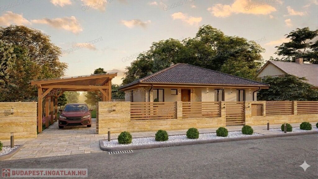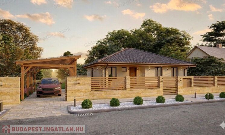 Parkolás 20nm faszerkezetű pergolával fedett kocsibeállóval megoldott.