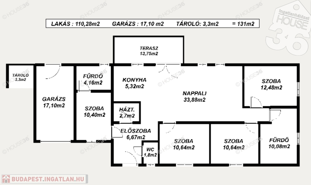 - Lakótér 110,28 m2, garázs 17,10 m2, terasz 14 m2, tároló 3,3 m2, 480 m2 telek (lásd alaprajzon)