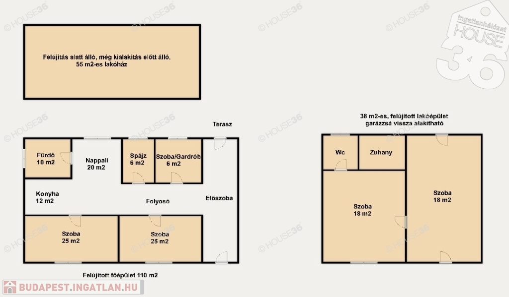 -Lakható épület: 38 m2 (teljeskörűen felújítva, fürdővel, de vissza alakítható garázzsá)