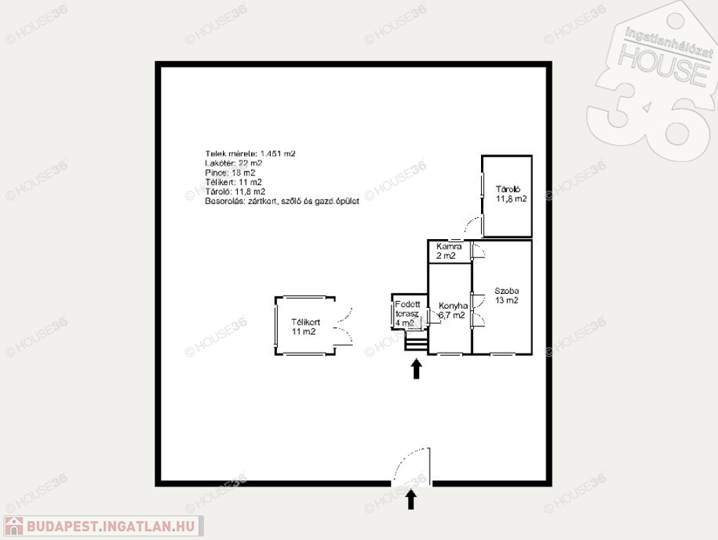 - Lakótér: 22 m2 (1 szoba, konyha, kamra)+ 4 m2 fedett terasz