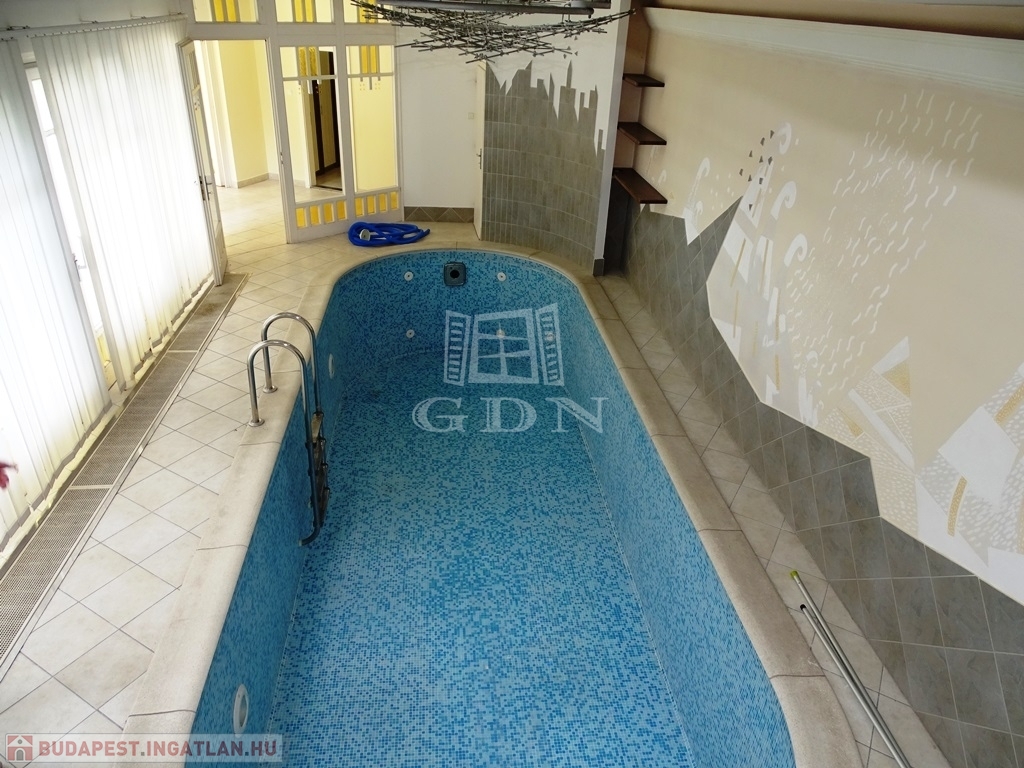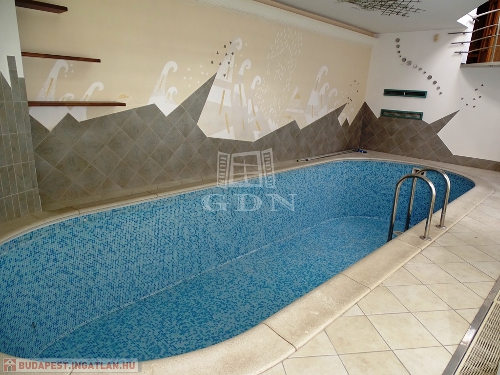 Az épületben a hatalmas, terasszal összenyitható, kandallós nappali, és a világos konyha mellett 6 szoba és 3 fürdőszoba található, exkluzivitását a különleges, A. VARGA IMRE festőművész által díszített beltéri medence adja, mellette egy nagyméretű szaunával.