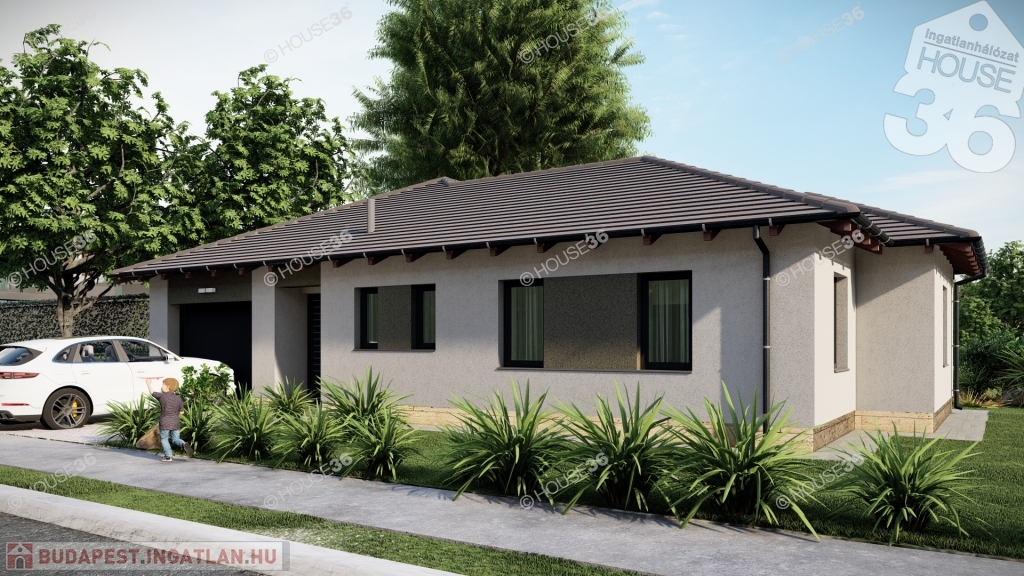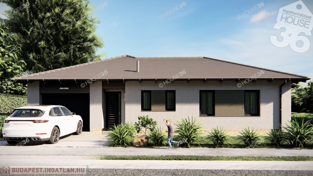 Földszintes kialakítású családi ház, nettó 129,18 nm hasznos lakótérrel, +13,33 nm terasszal, valamint egybeállós garázzsal.