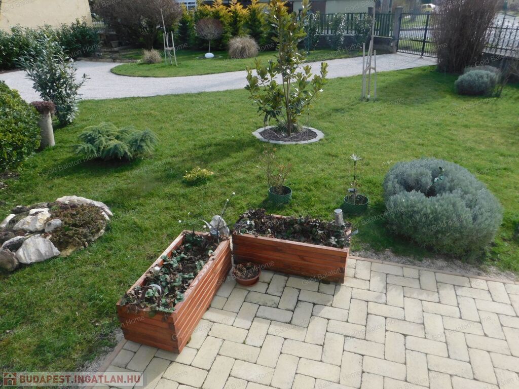 Teljes udvarrendezés, locsolórendszer kiépítése, külön vízórával.