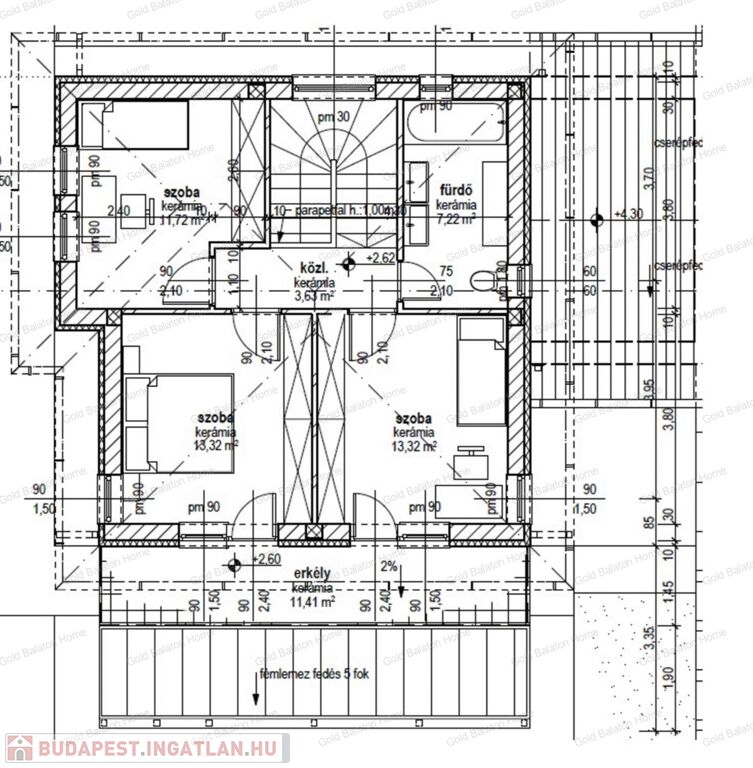 - emelet: közlekedő, fürdőszoba, 3 db hálószoba, WC, erkély