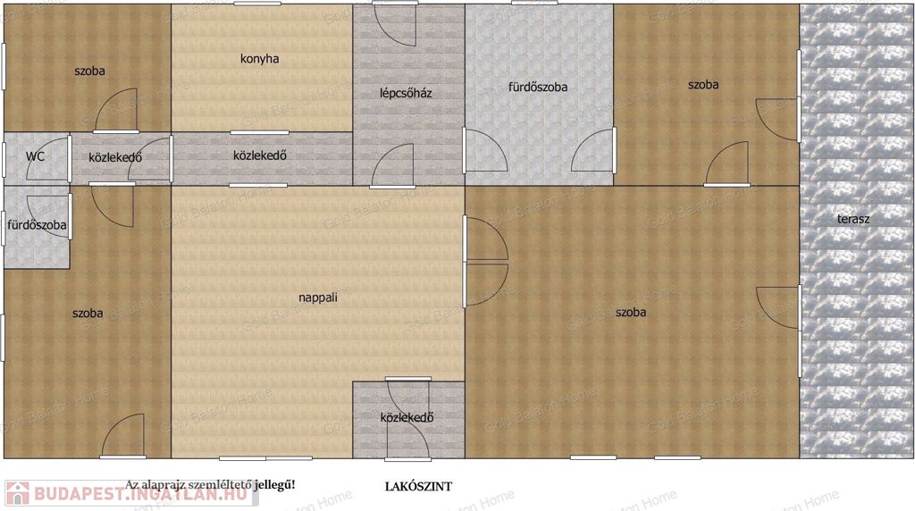- Tetőtéri helyiségek: amerikai konyhás nappali, négy szoba, kettő fürdőszoba, külön WC, közlekedő, tároló, erkély.