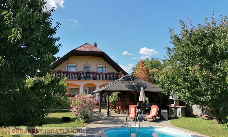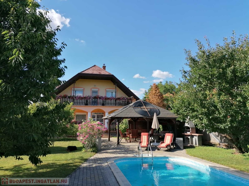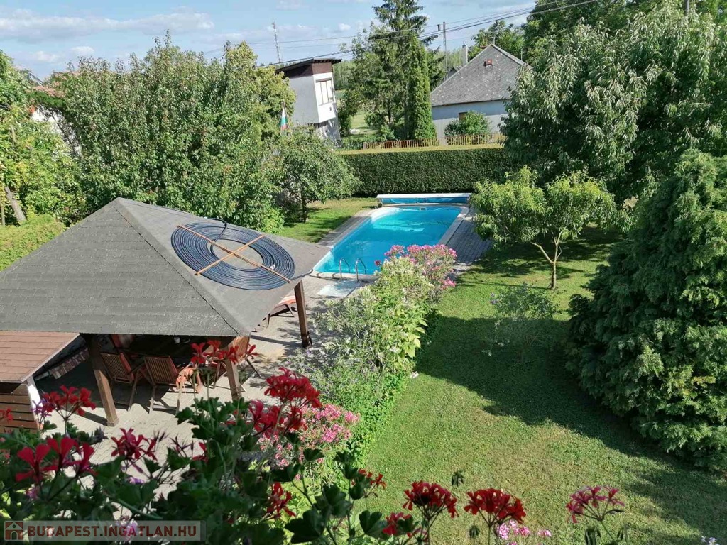 • Telek: 1000 m², gondozott udvar, grillező fedett pavilonnal, 7,5 m x 3,5 m-es medencével (gépészeti aknával).
