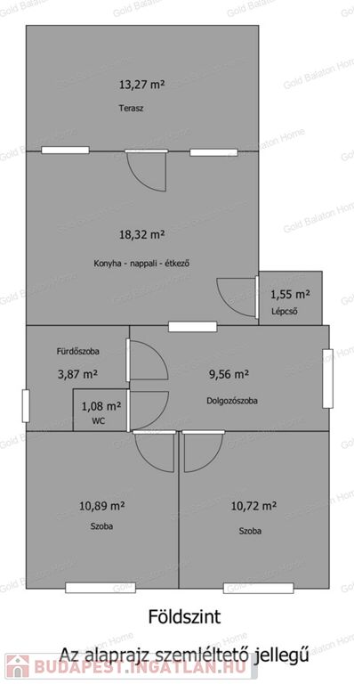 - földszint: amerikai konyhás nappali – étkező, teraszkapcsolat, 2 hálószoba, dolgozószoba, fürdőszoba, WC