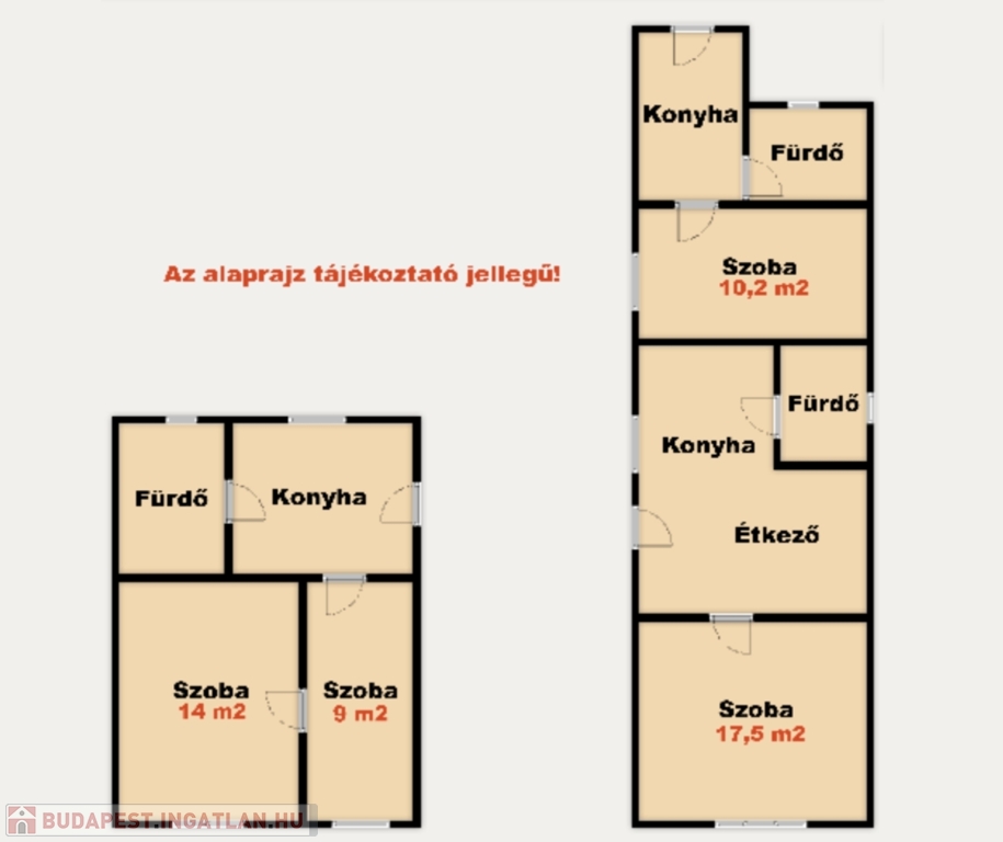 • Második lakrész (40 m²): Egy szoba, konyha-étkező, fürdő.
