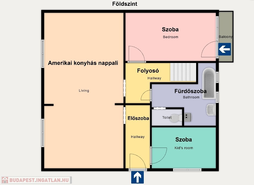 Az ingatlan földszintjén 2 szoba, amerikai konyhás nappali, fürdőszoba káddal, egy különálló wc, az épület elején és belső udvari részén fedett terasz található. Az emeleten 2 szoba, nappali, fürdőszoba zuhanyzóval és egy wc kapott helyet.