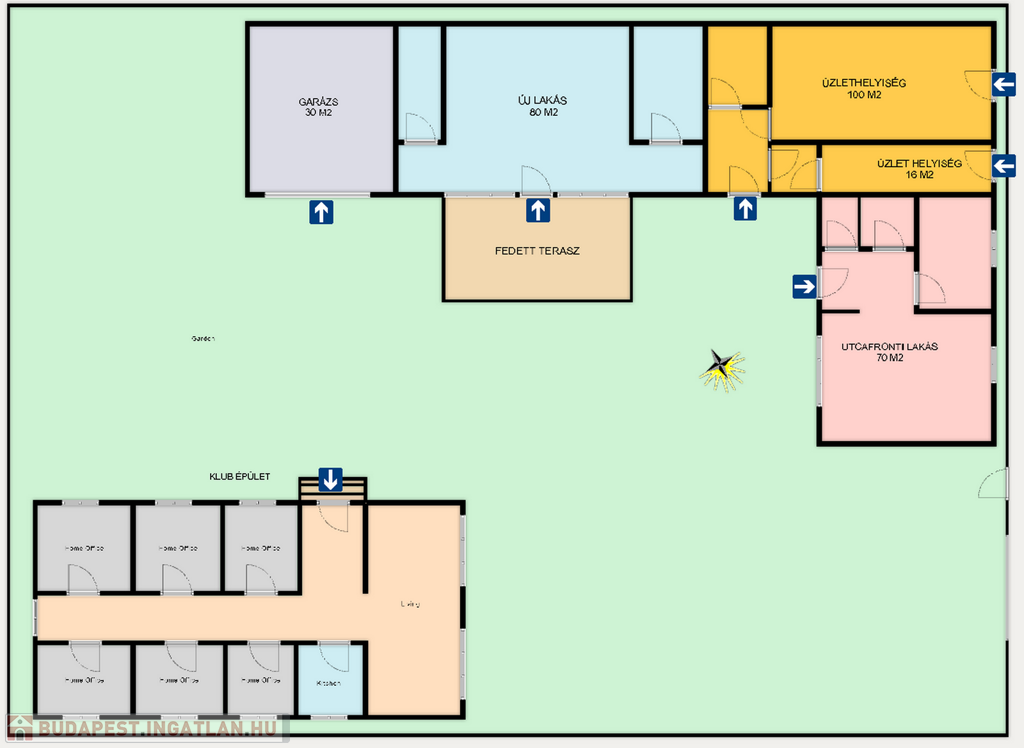 egy utcafronti lakás 70 m2, - egy vadonatúj belső udvari lakás 80 m2, - garázs 30 m2 és egy külön álló 8 helyiségből álló - 160 m2-es klub épület.