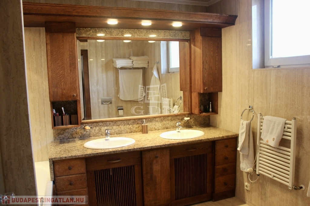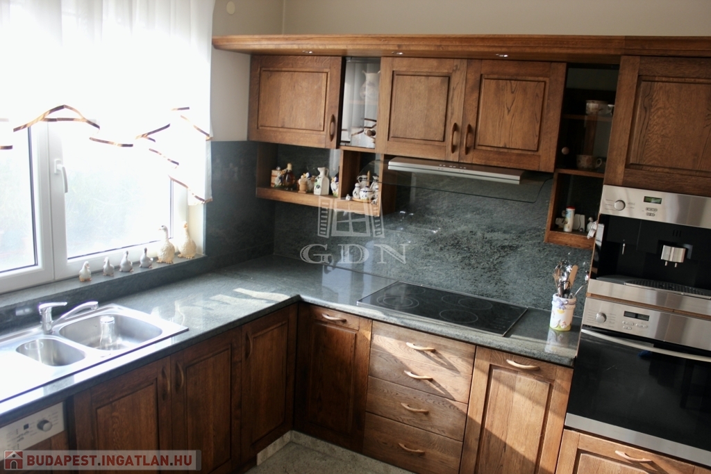 A ház belső tereit magas minőségű anyagok és megbízható műszaki megoldások jellemzik: a fürdőszobákban Laufen szaniterek, a közlekedőkben és vizes helyiségekben gránit burkolatok, míg a szobákban parketta és laminált padló található. A tölgyfából készült beltéri ajtók, a konyhabútor, a lépcső és a beépített gardróbszekrények egyedi kivitelezésűek. A földszinti nappaliban beépített kandalló és stílusos bárszekrény pedig tovább erősíti az otthon meleg, elegáns hangulatát.