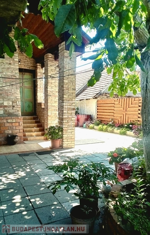 A házhoz kapcsolódik egy hangulatos, rusztikus stílusú, fedett terasz, amely egyedi elképzelések alapján, gondos kivitelezéssel készült.