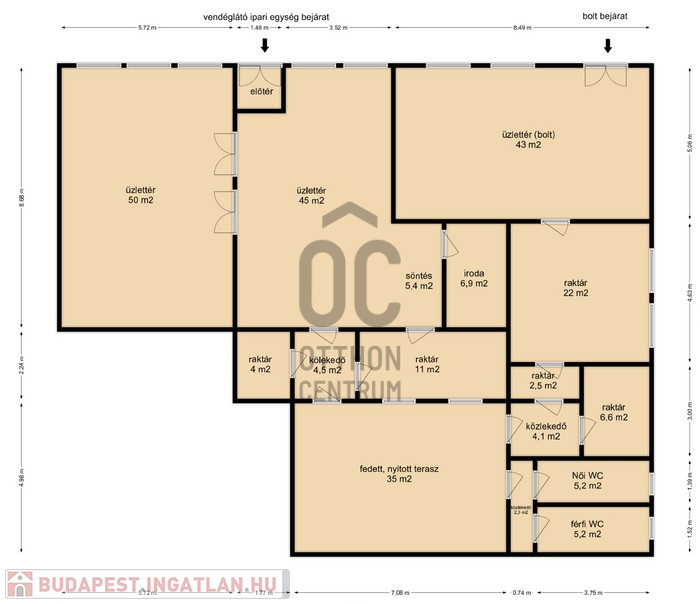 - 1209 m2- es telken helyezkedik el, a kettő HRSZ számon lévő ingatlan, mely egy 130 m2-es vendéglátó egységből és egy 81 m2-es boltból áll.