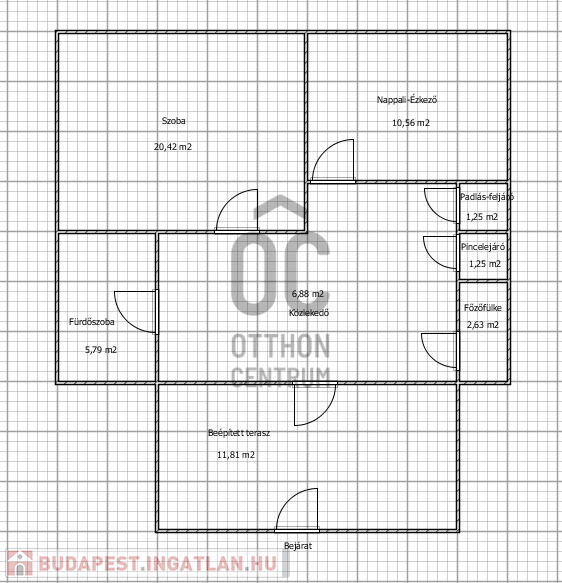 Az ingatlanban a beépített teraszon kívül két külön nyíló szoba található, főzőfülke, közlekedő, fürdőszoba, padlásfeljáró és pincelejeráró.