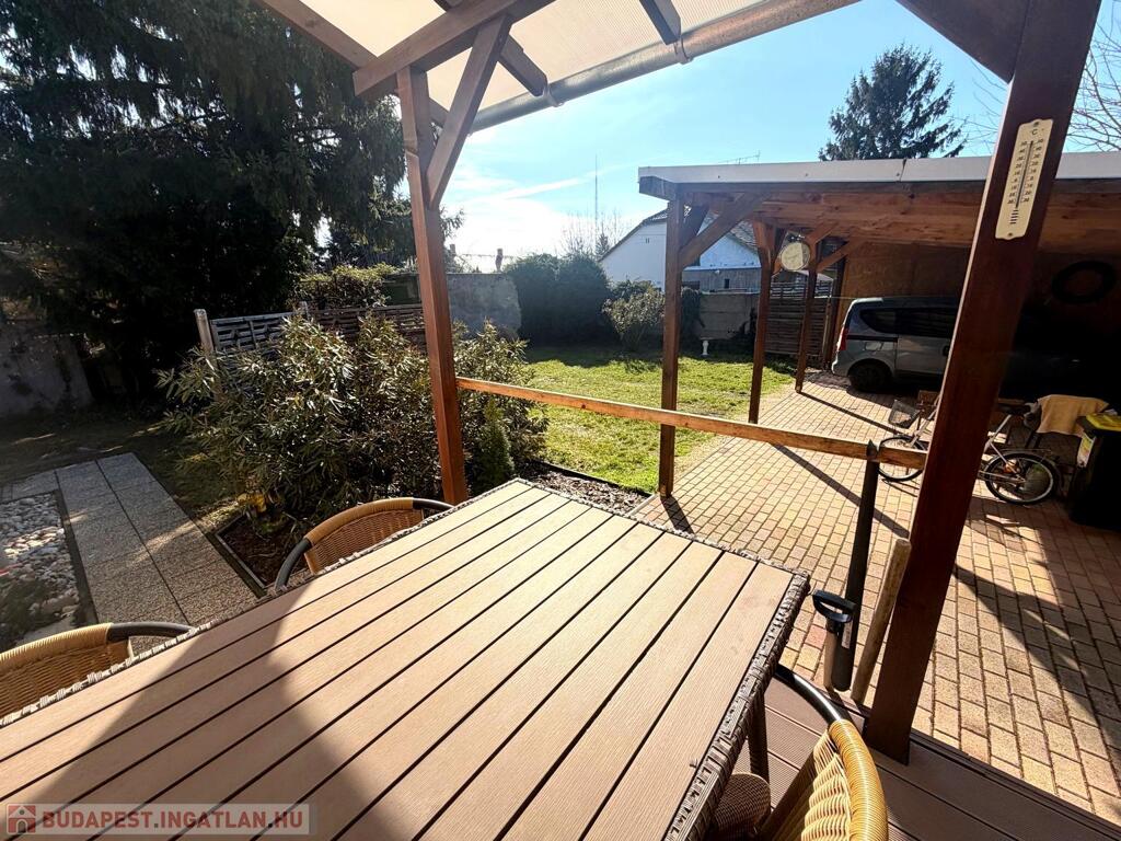 A 445 m²-es telek élhető méretű, könnyen karbantartható, rendezett és körbekerített. Egy kétállásos fedett kocsibeálló és egy kerti tároló tovább növeli a praktikumot, a részben térkövezett beálló pedig kényelmes parkolást biztosít.