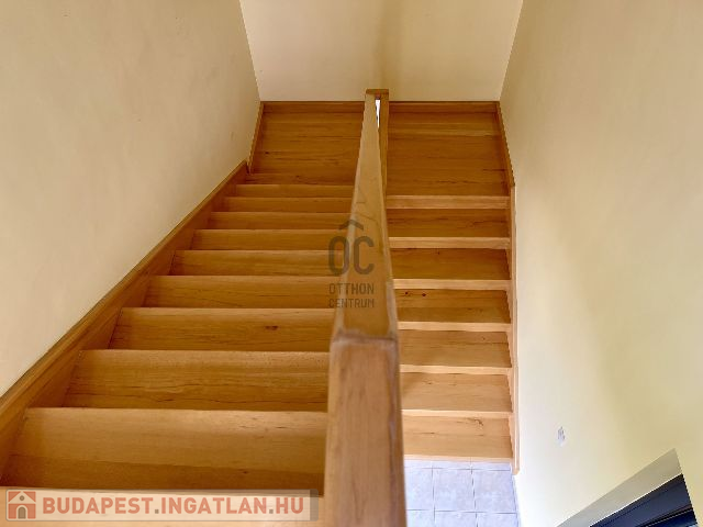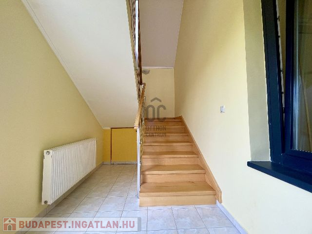 A lépcsőházban széles bükkfa lépcső vezet a világos és tágas emeleti szintre, ahol nappali és két hálószoba, zuhanyzóval felszerelt fürdőszoba és külön mellékhelyiség található.
