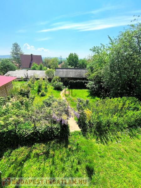 A kert rendezett, telis-tele virágokkal, dísznövényekkel, gyümölcsfákkal és a kert végében egy tároló helyisggel.