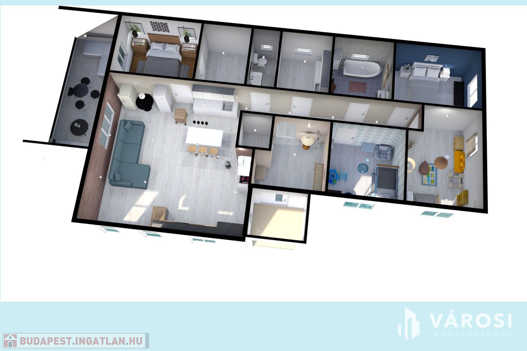 - 123 m2 alapterületen, tágas előszoba, közlekedő, AMERIKAI KONYHÁS NAPPALI, kamra, + 4 HÁLÓSZOBA, gardrób,