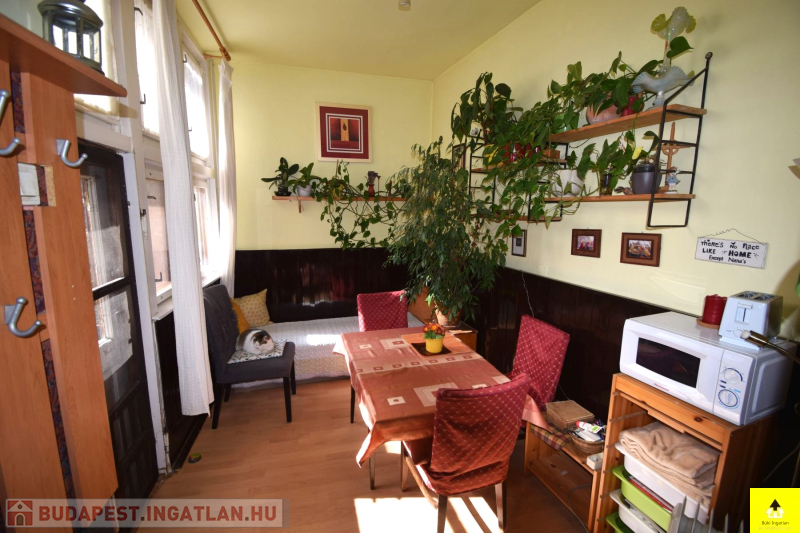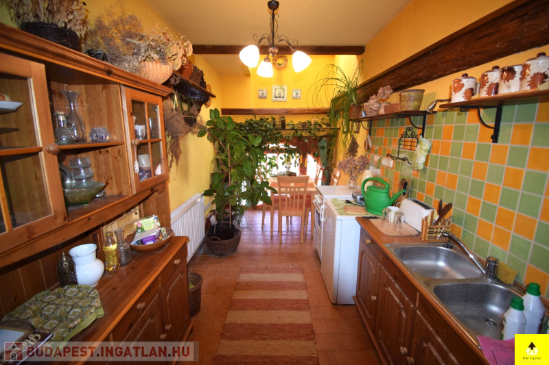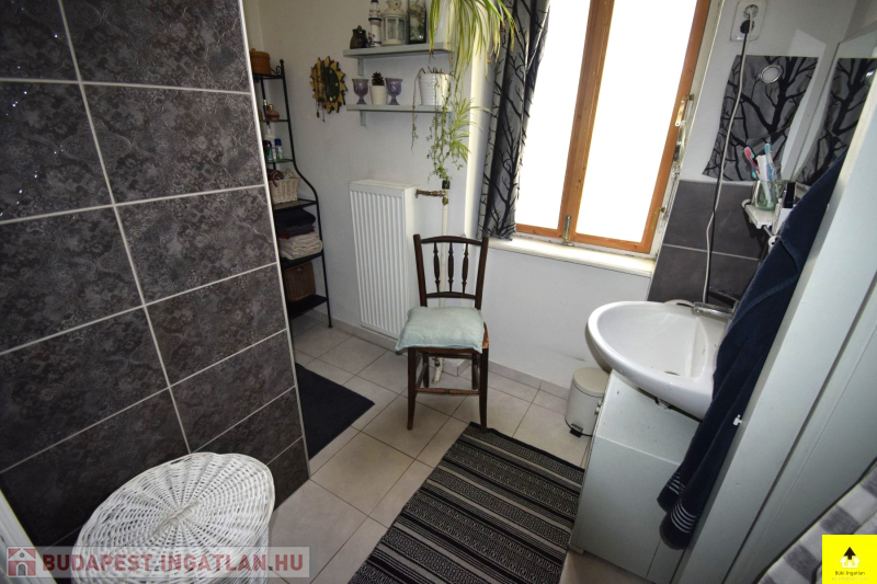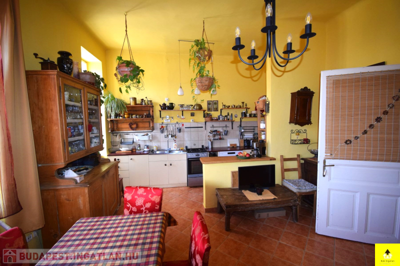 Szintén a földszinten található egy 45 m2-eslakás. Itt egy utcafronti szoba, egy konyha, egy kamra, egy közlekedő, fürdőszoba wc-vel és egy zárt veranda került kialakításra.