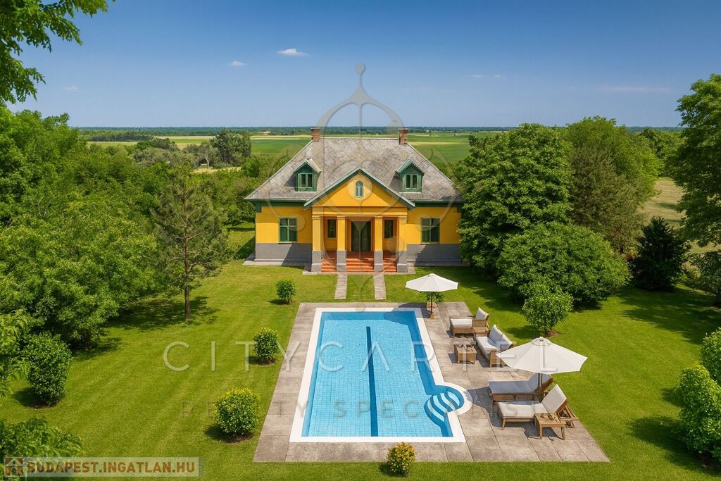 A rét fölött fátyolszerű köd sodródik, engedve a felkelő nap aranyló simításának. A harmat ezernyi apró gyöngyként ragyog a fűszálakon, a levegő friss, szinte érinthetően tiszta. A kúria széles tornácáról a tekintet lassan végigsiklik a végtelen zöldön, majd megakad a mozdulatlanul pihenő lovakon. A kertben a medence víztükre úgy őrzi a hajnal színeit, mintha egy festő most tette volna le az ecsetet. A konyha felől frissen őrölt kávé illata bontja meg a csendet – a birtok lassan ébredezni kezd.