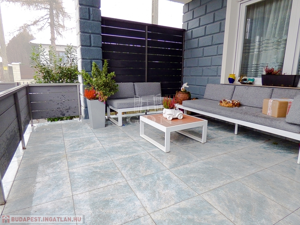 A kert rendezett, karbantartott, gyönyörű babérmeggy sorral körbekerített, ezzel is biztosítva az intim szférát. A hátsó rész alkalmas kikapcsolódásra, pihenésre, az oldalsó részen automata kapun keresztül megközelíthető felszíni gépkocsi beálló (akár 5 autó számára) kapott helyet, továbbá ásott - gyűrűs kút, öntöző rendszer, robot fűnyíró és a kert végében lévő 45 nm-es szigetelt tároló áll az új tulajdonosok rendelkezésére.