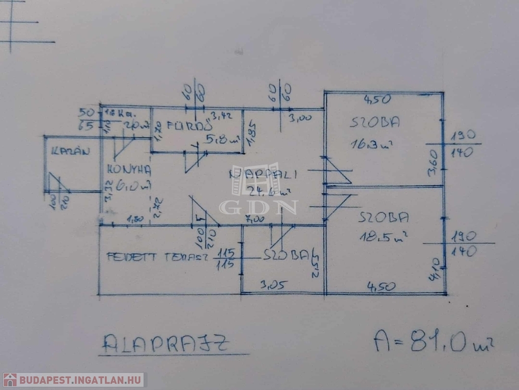 A délkeleti tájolású ingatlan 81 négyzetméteres, melyhez közel 20 négyzetméteres fedett terasz is tartozik.