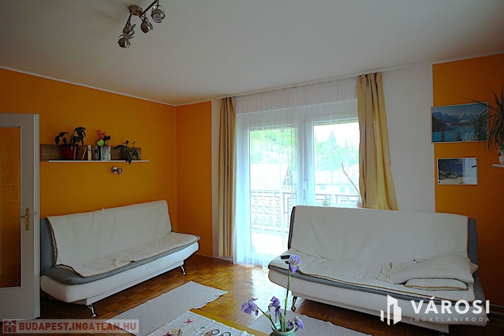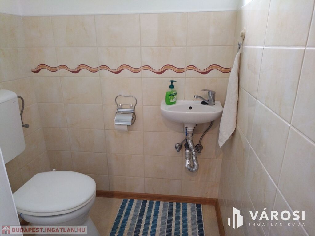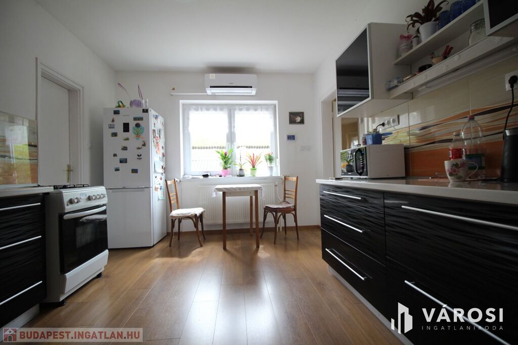 A felső szinten 100 m2-es, három szobás lakás van konyhával, nagy konyhai tárolóhelyiséggel, fürdőszobával, külön WC-vel, és egy nagy erkéllyel.