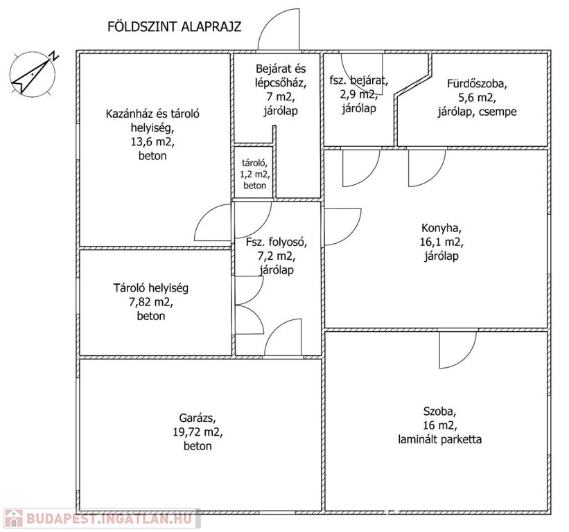 A földszinten 50 m2-es lakás található egy szobával, konyhával, fürdőszobával. Itt még garázs, tárolóhelyiségek, és kazánhelyiség is van.