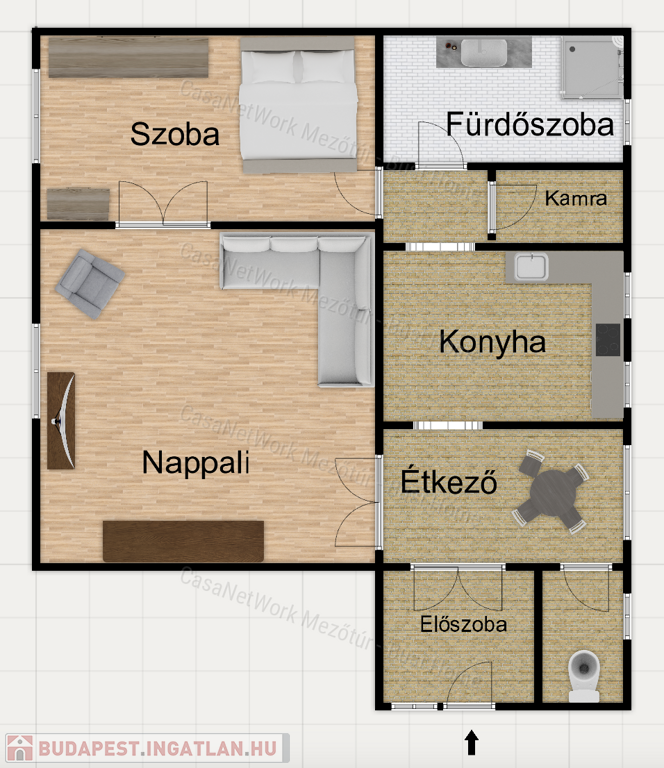 - 60 m2, 2 külön és egybe is nyíló hálószoba, étkezős konyha, fürdőszoba, wc, kamra
