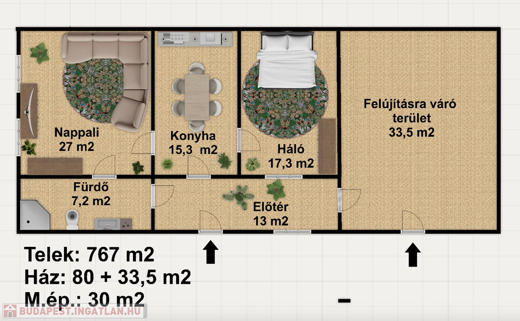 - A főépület mellett található még egy beltéri és egy külső bejárati ajtón keresztül megközelíthető 33m2-es tároló, aminek a felújításával, további lakószoba vagy nappali alakítható ki.