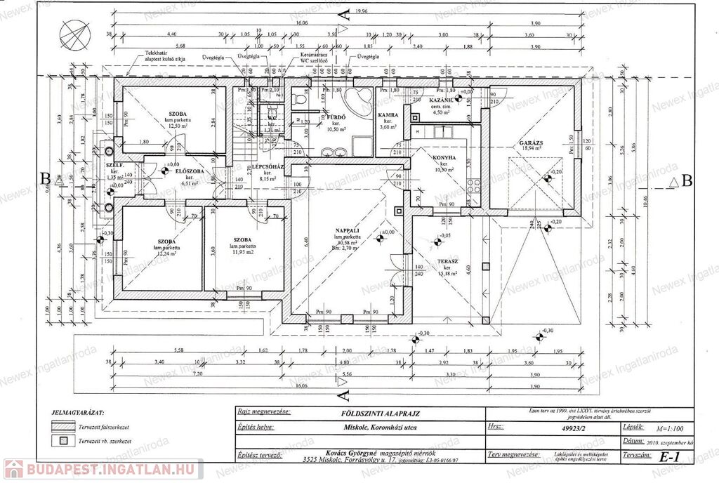 Alsó szint: amerikai konyhás-étkezős-nappali, 3 hálószoba, kádas + zuhanyzós fürdő, külön WC, kamra, kazánház, előszoba, közlekedő, tároló, terasz és garázs.
