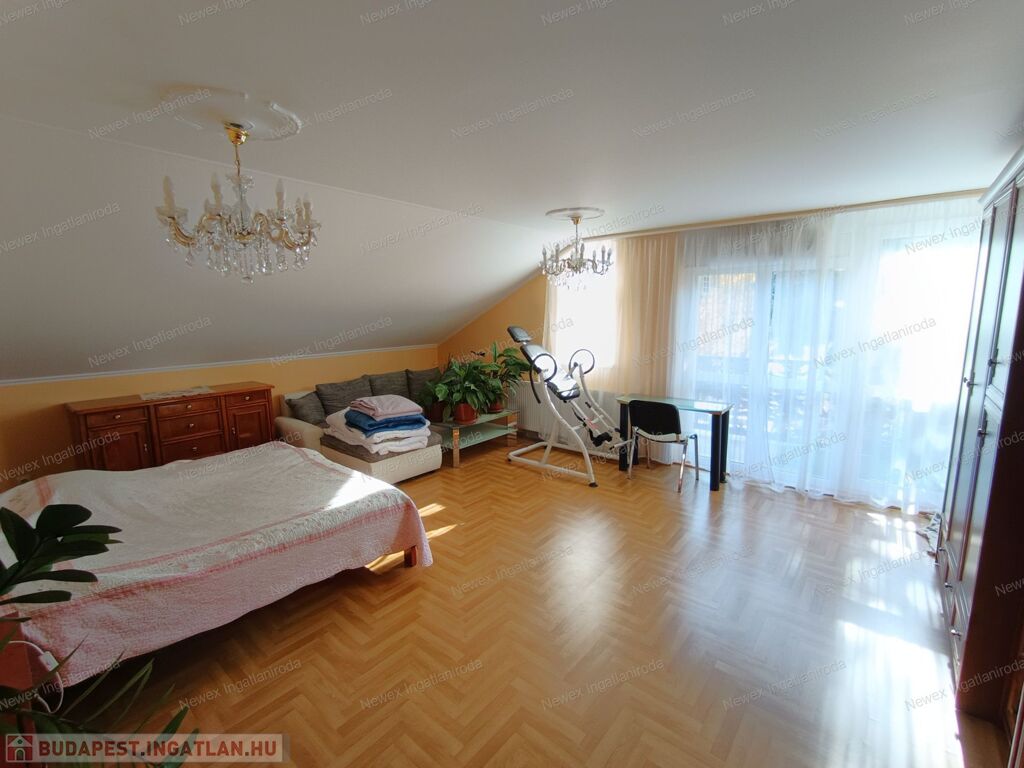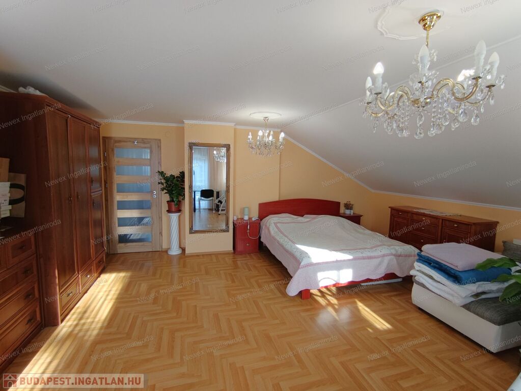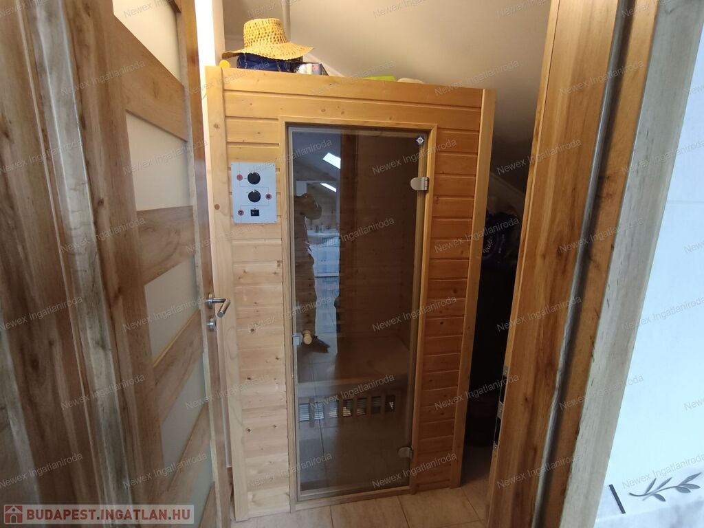 Tetőtér: 4 szoba, társalgó, fürdő (zuhanyzó + hidromasszázs kád + WC), szauna, külön WC, 2 erkély