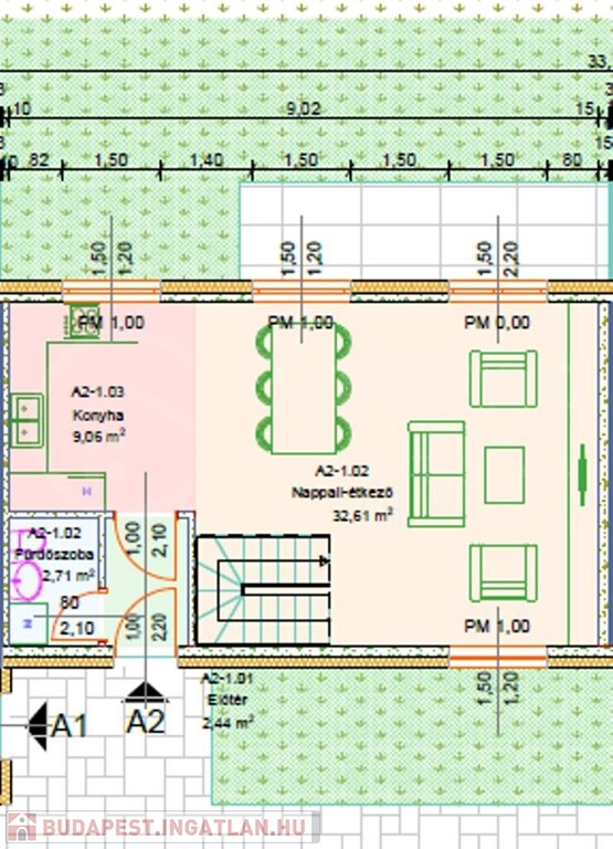 • Földszint: Tágas, napfényes amerikai konyhás nappali étkezővel, valamint egy vendég mosdó-WC.