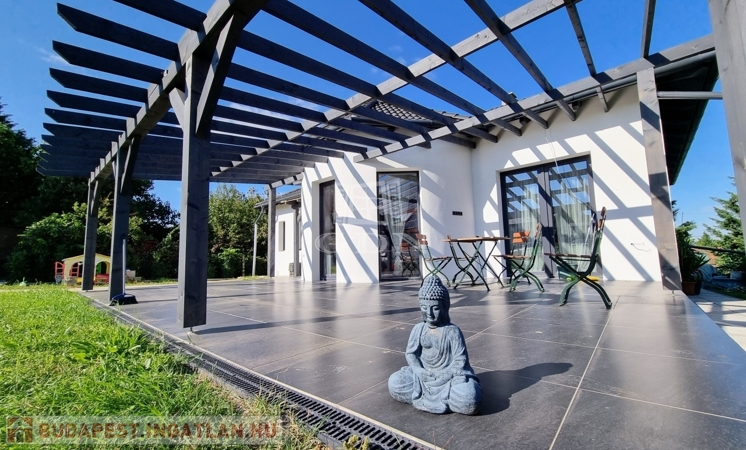 A nappaliból közvetlenül egy hatalmas, ~50 négyzetméteres külső teraszra léphetünk, amely elegáns antracit színű, modern burkolatot kapott.