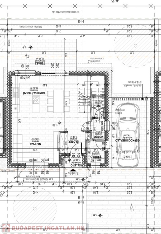 ingatlanonként két gépkocsi számára biztosított, ebből egy parkolóhely a ház előtti területen kialakítható.