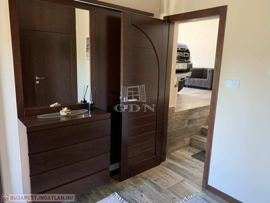 A ház modern komfortját padlófűtés (Viessmann kazán), valamint teljes körű okosotthon-vezérlés biztosítja, biztonságáról pedig korszerű riasztó- és kamerarendszer gondoskodik.